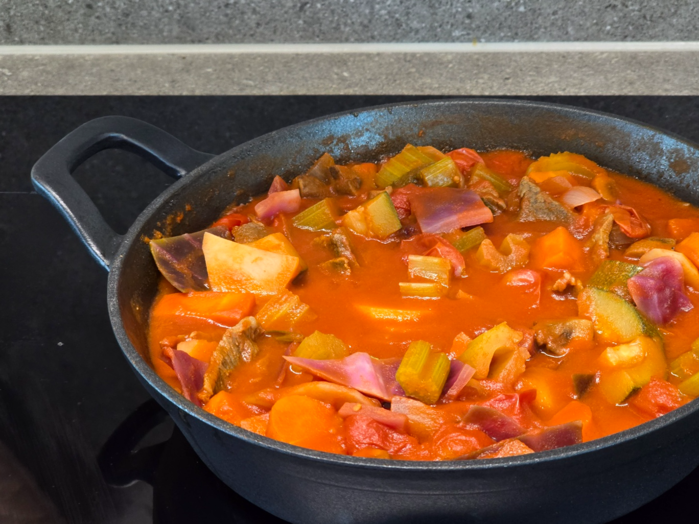 - 양파·당근·토마토·적양배추·주키니·감자·버섯·셀러리를 한꺼번에 투입→센불 3분.