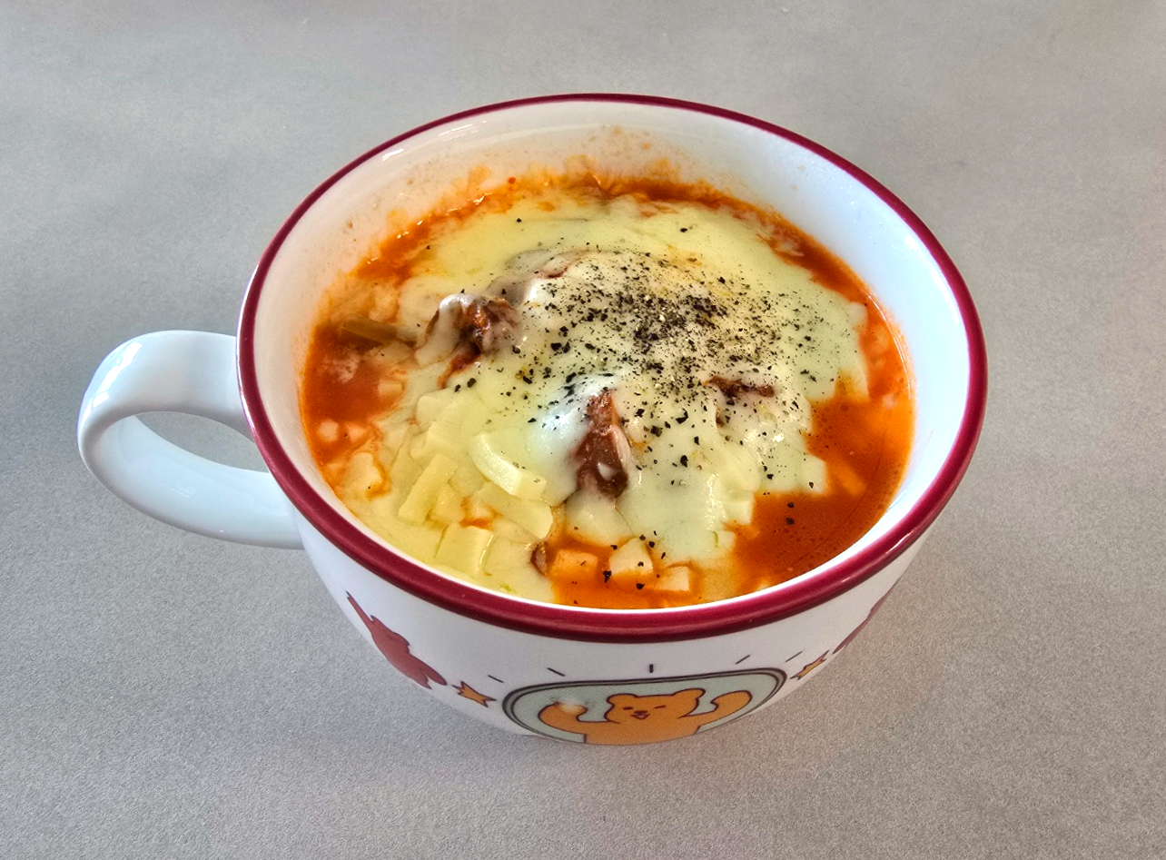 - 뜨거운 스프 위에 체다 또는 모짜렐라 슬라이스 1장 솔솔 녹입니다.