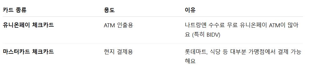 - ✅ BIDV ATM에서 유니온페이 카드로 인출 가능 (수수료 없음!)