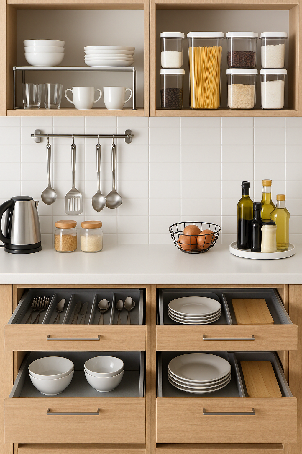 - 수직 공간 활용: 선반 확장대, 걸이형 수납으로 공간을 2배로