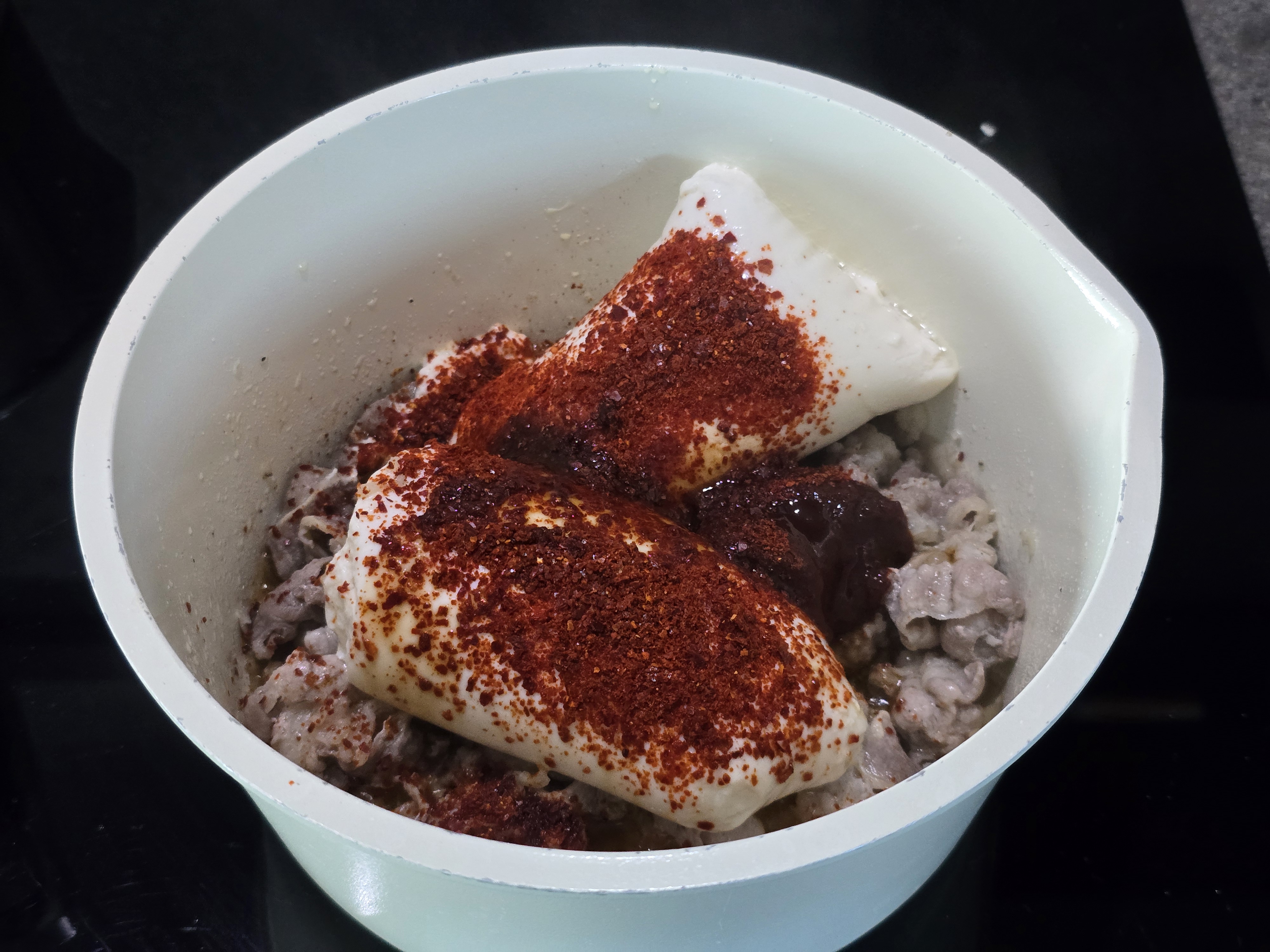 고추장 + 고춧가루 + 간장 + 굴소스로 양념합니다.